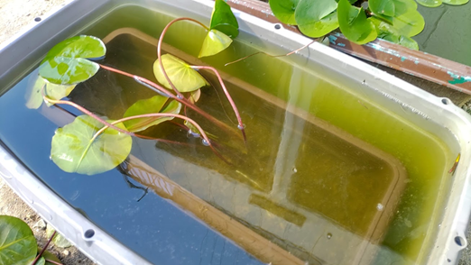 まだ諦めない姫睡蓮。いろいろ調べたところ、肥料に窒素が多いと葉や株が増えるらしい。植え付けるときに園芸用の土を多めに入れたので、それの影響かもしれない。